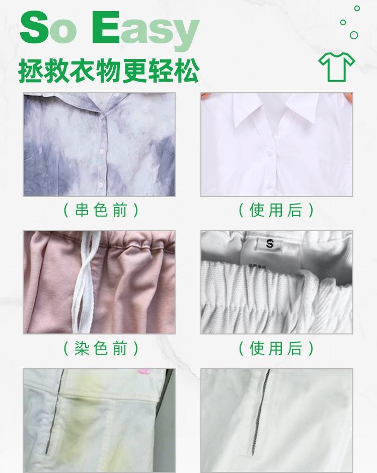 根据面料不同,有些衣服可能去除较慢,可以重复加料一次(把衣服拿出,放料搅匀后先测试,再放衣服)。